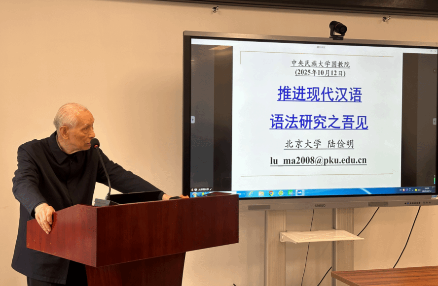 新闻网讯  10月12日,国际教育学院在海淀校区举办学术讲座,邀请著名语言学家、北京大学陆俭明先生与马真先生,分别以《推进现代汉语语法研究之吾见》和《要注意培养自己发现问题的能力》为题,围绕现代汉语研究与学术能力培养分享核心观点。本次讲座是“本科生课程思政团队建设项目”“研究生精品示范课程培育项目”“中央民大‘交叉学科协同攻关项目’”和“国家民委‘高校教学改革创新项目’”系列讲座之一。讲座由国际教育学院院长陈天序主持,娄开阳教授与谈。